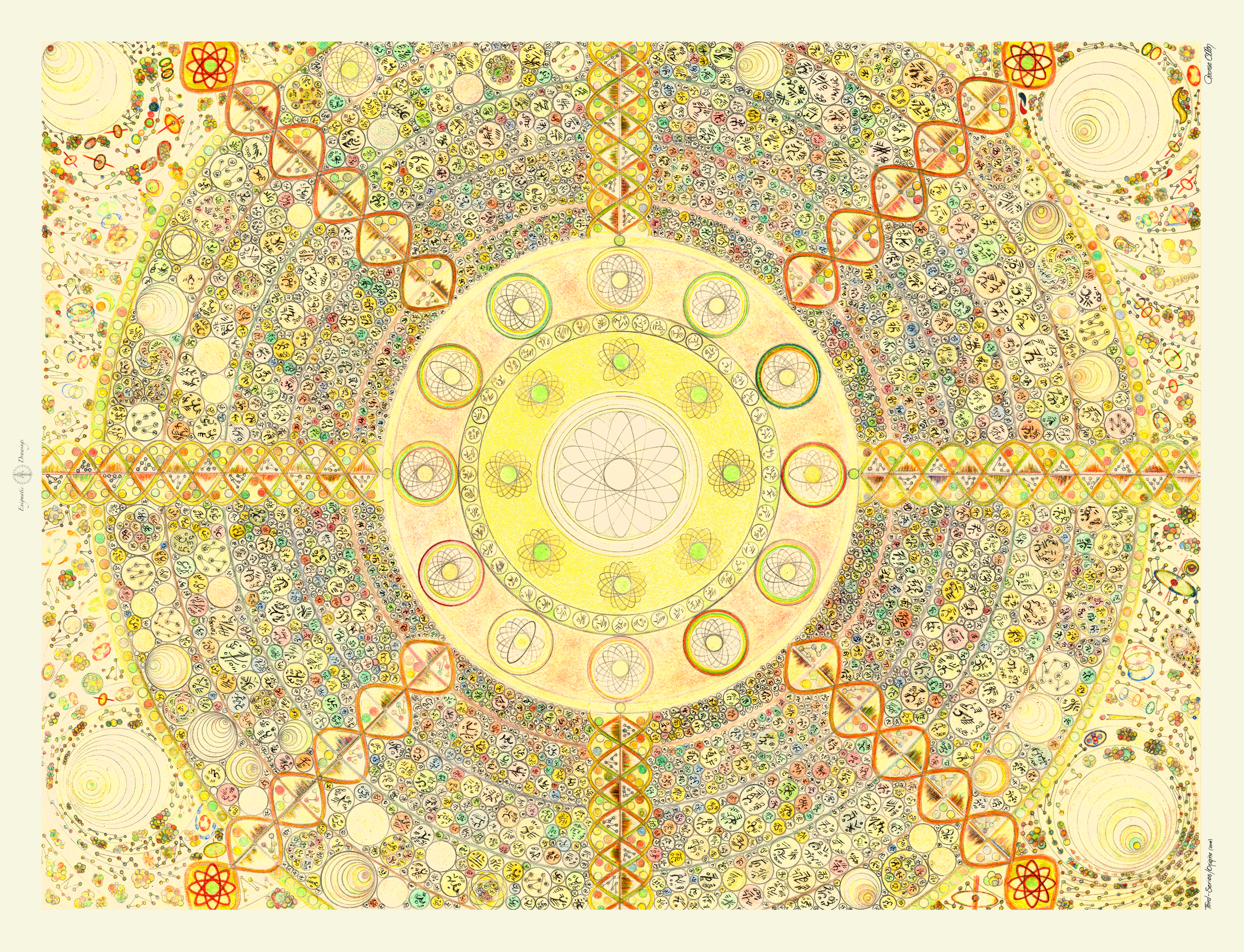Seen in person, the works reveal a very different order of detail. Fine script systems, repeated geometric structures, nested circular fields, architectural symmetries, and layered cosmological forms become legible in ways that are difficult to reproduce on screen. The exhibition therefore functions not simply as a display of prints, but as a spatial extension of the archive itself.