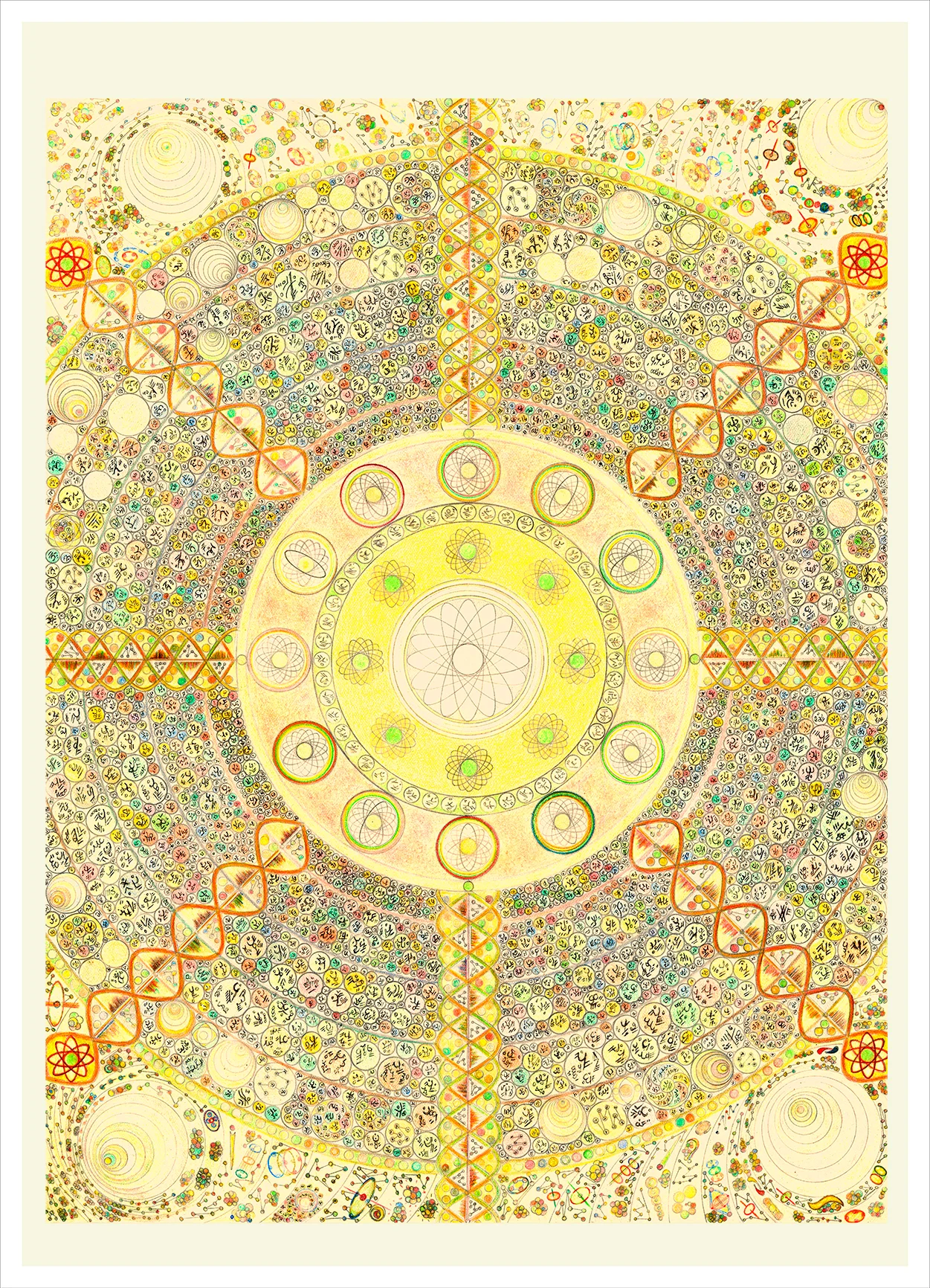 UNIQUE AND EXTRAORDINARY, THIS DRAWING EVOKES PROFOUND REACTIONS IN THE OBSERVER. ITS LEVEL OF DETAIL AND COMPLEXITY IS UNPRECEDENTED, RESULTING IN A MORE DETAILED AND COMPLEX DRAWING THAN ALL OF ITS PREDECERS (FIRST-SERIES / 18 SEQUENTIAL DRAWINGS ) COMBINED. THIS ARTWORK CONTAINS AROUND 20,000 SYMBOLS TAKING OVER 2,500-HOURS OF DRAWING TIME OVER 5-YEARS TO COMPLETE AND IT IS LAYERED WITH DETAILS THAT REVEAL THEMSELVES ONLY TO THE ASTUTE OBSERVER.