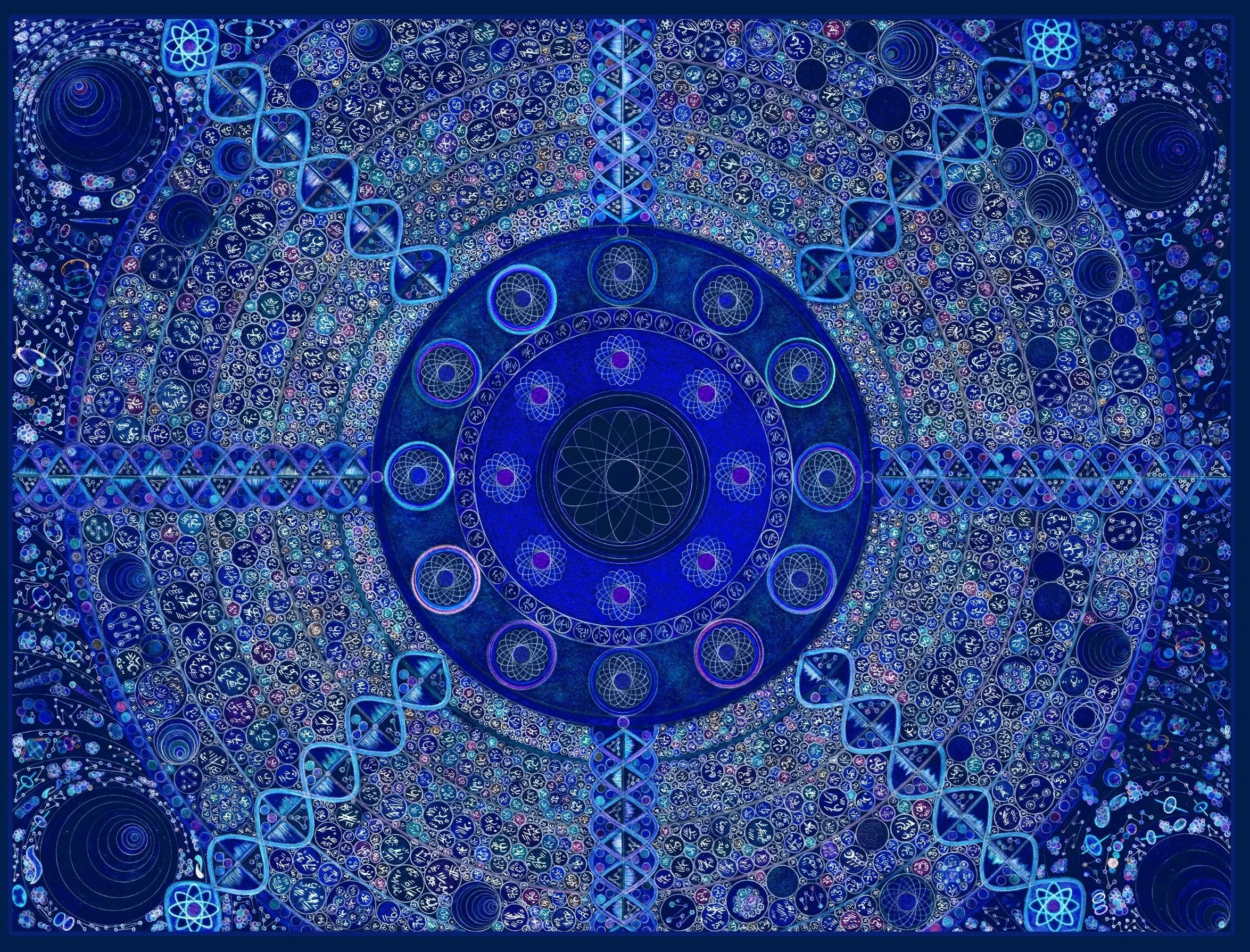 Genesis Series: The Genesis Series is a captivating collection of 18 sequential drawings that delve into themes of creation, evolution, and interconnectedness. Each artwork features elements of human anatomy, atomic structures, cosmic patterns, DNA helices, and thousands of unknown symbols. The series incorporates planetary and galactic themes, star maps, and sacred geometry, creating a rich visual tapestry. Human energy systems and chakras are central, highlighting the flow of spiritual energy. These components are harmonized within concentric circles and geometric patterns, inviting viewers to contemplate the mysteries of life and our place in the cosmos.